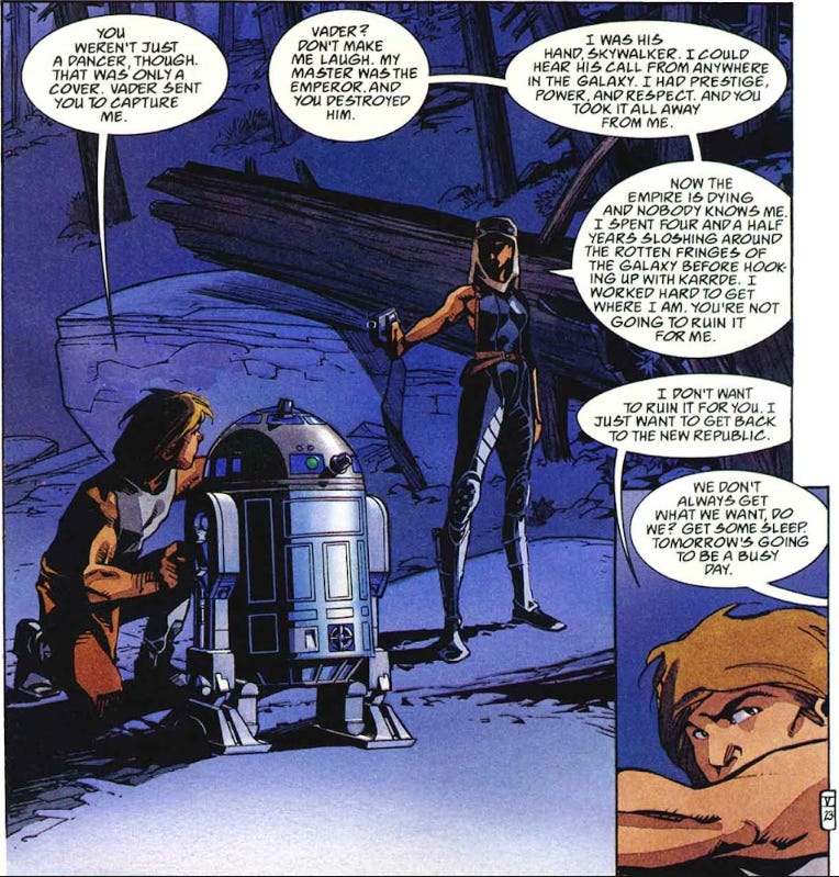 If you are unfamiliar with Mara Jade, the character was introduced in Timothy Zahn’s Heir to the Empire novel. She was originally the Emperor’s Hand and trained in espionage and assassination.