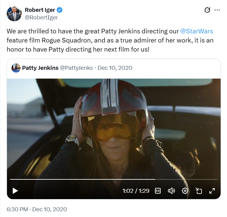 In March 2024, Jenkins announced a new deal with Lucasfilm to make the Rogue Squadron film after Wonder Woman 3 fell apart at Warner Bros. She said on the Talking Pictures Podcast: