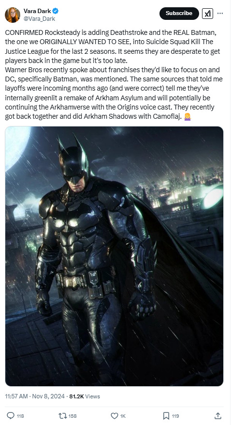 She wrote, “Warner Bros recently spoke about franchises they'd like to focus on and DC, specifically Batman, was mentioned. The same sources that told me layoffs were incoming months ago (and were correct) tell me they've internally greenlit a remake of Arkham Asylum and will potentially be continuing the Arkhamverse with the Origins voice cast.”