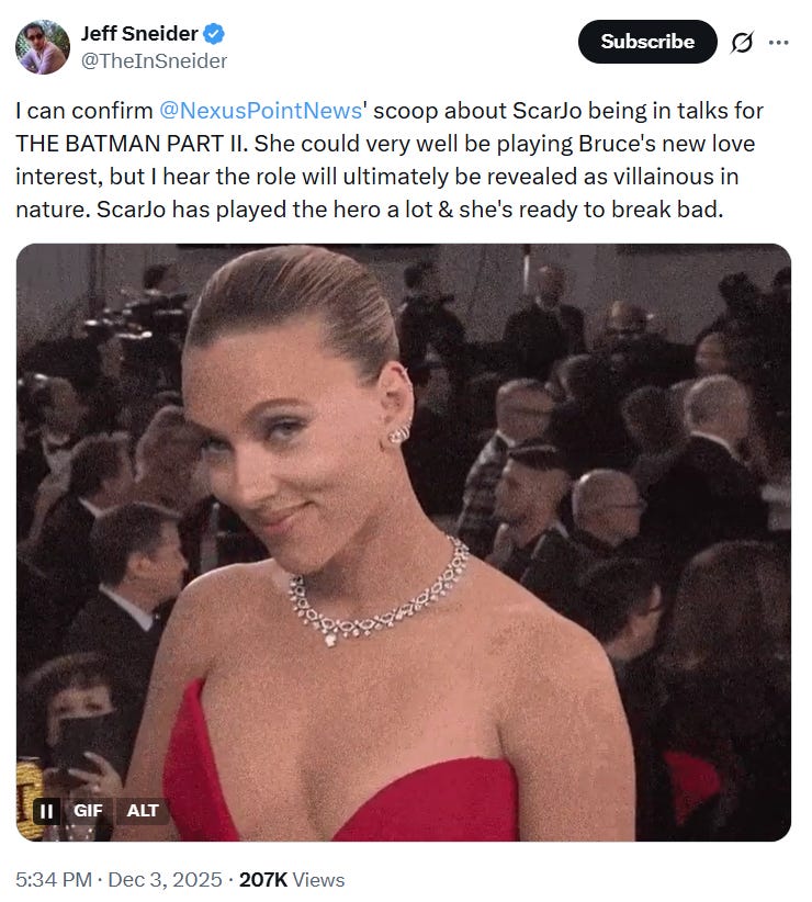 Nexus Point News originally reported the rumor with Matthew W. writing, “Sources tell Nexus Point News that Scarlett Johansson is in talks to join The Batman - Part II. Details on who Johansson would potentially portray are being kept under wraps, but the role may be a new love interest to Bruce Wayne.”