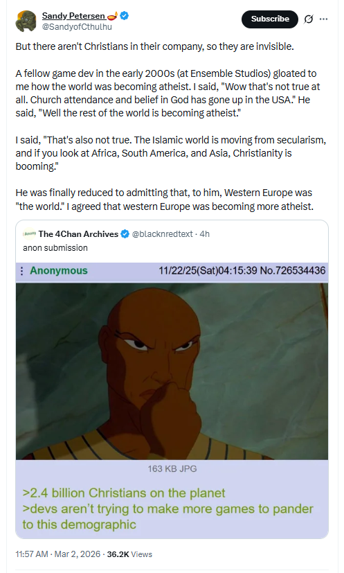 Petersen then shared an example from his time at Ensemble Studios, “A fellow game dev in the early 2000s (at Ensemble Studios) gloated to me how the world was becoming atheist. I said, ‘Wow that's not true at all. Church attendance and belief in God has gone up in the USA.’ He said, ‘Well the rest of the world is becoming atheist.’ I said, ‘That's also not true. The Islamic world is moving from secularism, and if you look at Africa, South America, and Asia, Christianity is booming.’ He was finally reduced to admitting that, to him, Western Europe was ‘the world.’ I agreed that western Europe was becoming more atheist.”
