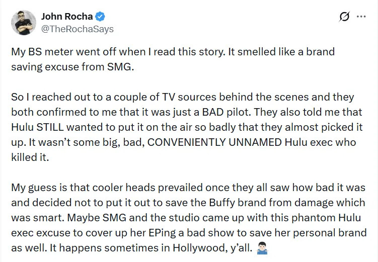 “They also told me that Hulu STILL wanted to put it on the air so badly that they almost picked it up. It wasn’t some big, bad, CONVENIENTLY UNNAMED Hulu exec who killed it,” he added. “My guess is that cooler heads prevailed once they all saw how bad it was and decided not to put it out to save the Buffy brand from damage which was smart. Maybe SMG and the studio came up with this phantom Hulu exec excuse to cover up her EPing a bad show to save her personal brand as well. It happens sometimes in Hollywood, y’all.”