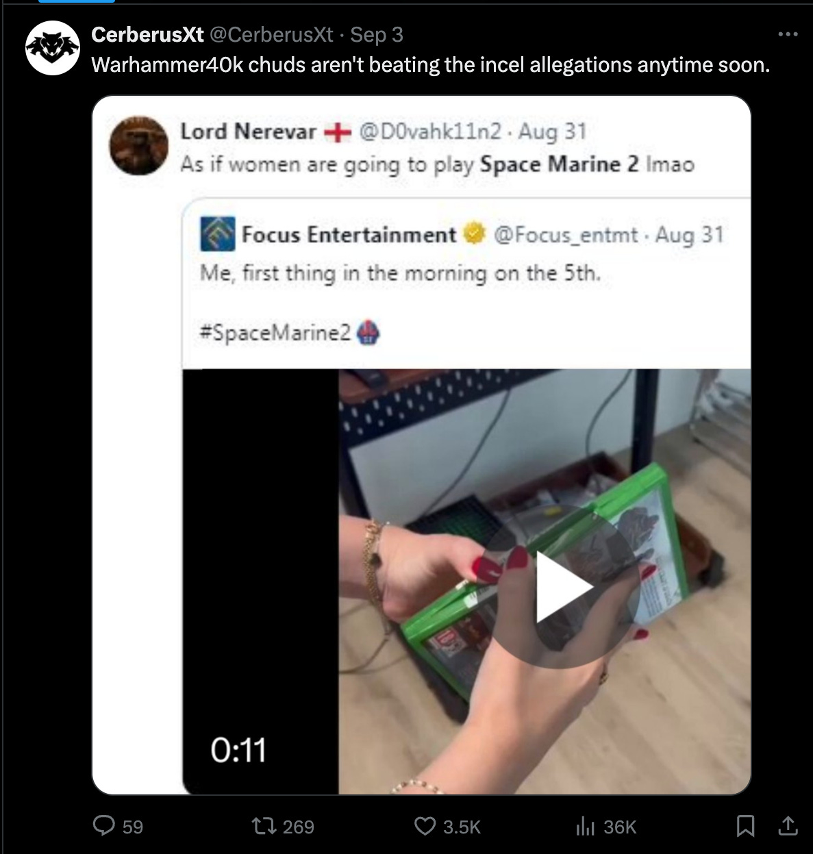 CerberusXt has been on top of all of these controversies, using them to attack the Warhammer 40K player base as “chuds” and “incels,” trying to gaslight fans into believing most players are fine with the DEI changes to the settings. His X feed is one constantly attacking Warhammer 40K players and influencers.
