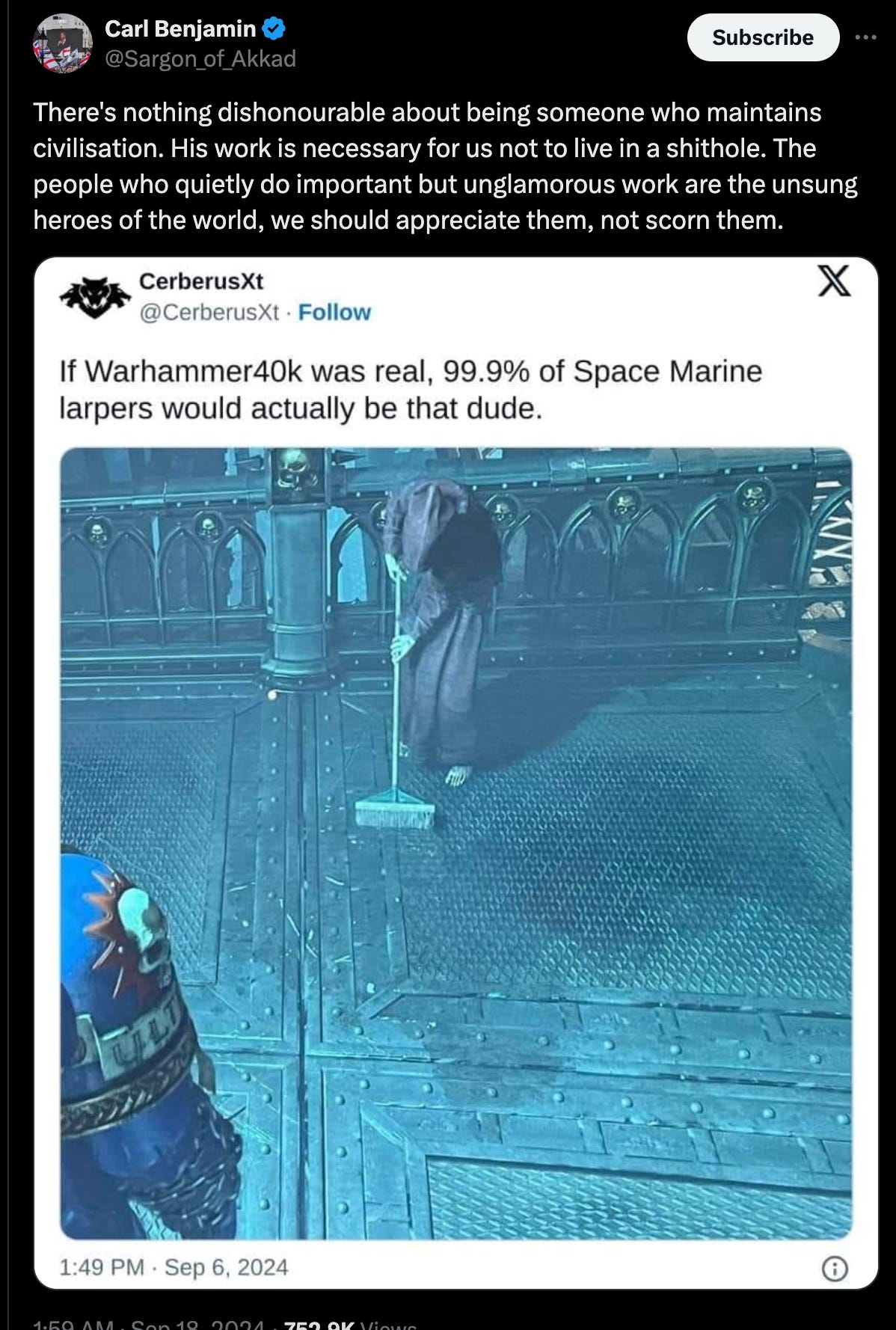 Paths crossed between Sargon and CerberusXt when CerberusXt made a tone-deaf post mocking his fellow Warhammer 40K players. CerberusXt posted to X saying, “If Warhammer40K was real, 99.9% of Space Marine larpers would actually be that dude.” This was coupled with an image of a janitor sweeping the floors of a room in the Space Marine 2 video game.