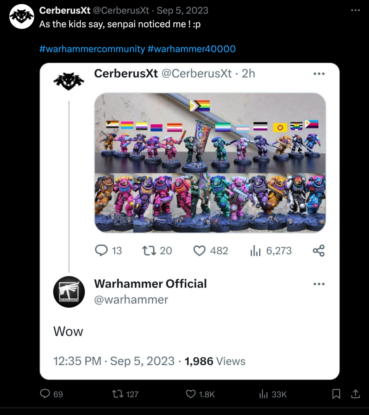 The entire purpose of his work appears to be access and clout, as he came to some prominence earlier this year with painted miniatures featuring pride flag colors in different arrangements. This was propagated by a Warhammer 40K fanzine and eventually amplified by the official Warhammer X account to promote degenerate lifestyles within the Warhammer 40K community.