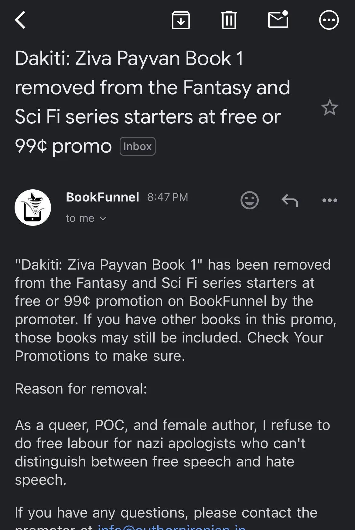 The promotion titled “Fantasy and Sci Fi series starters at free or 99 cents promo” was being run on BookFunnel, and he got this notice from them: