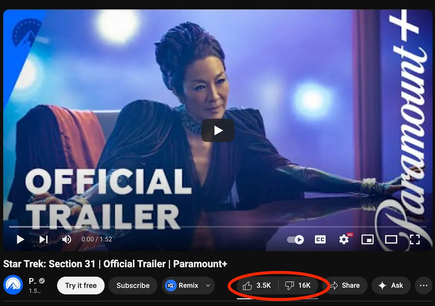 The Paramount+ official trailer has 2.2 million views but only 3.5K likes as of the end of December, with a whopping 16K dislikes. That’s a 4.5x factor of dislikes to likes and very little engagement at all, considering how many views it has.