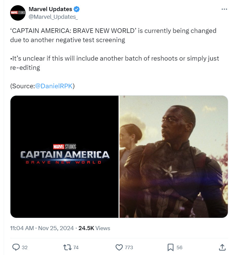 After these reshoots it was reported by Marvel_Updates that scooper Daniel RPK alleged that Marvel Studios was making changes to the film following another negative test screening.