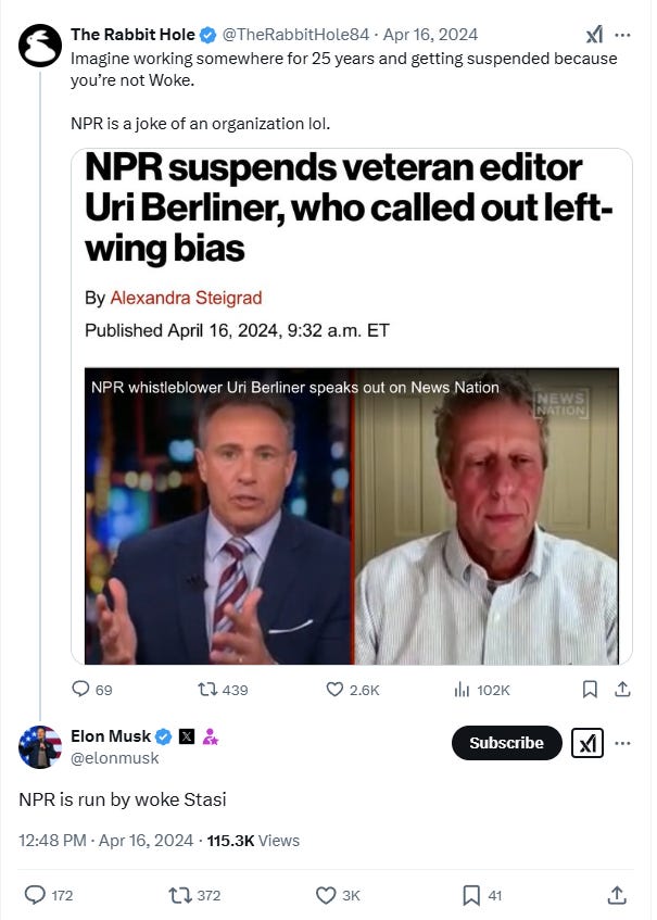 Less than a week later he said, “NPR is run by woke Stasi.”