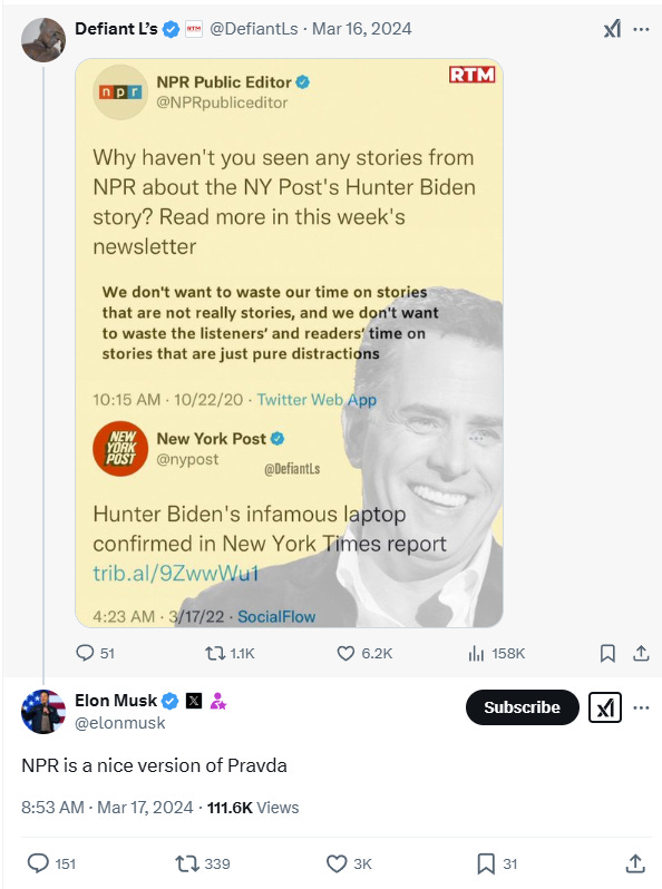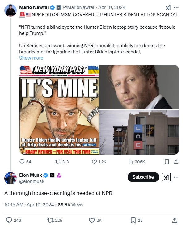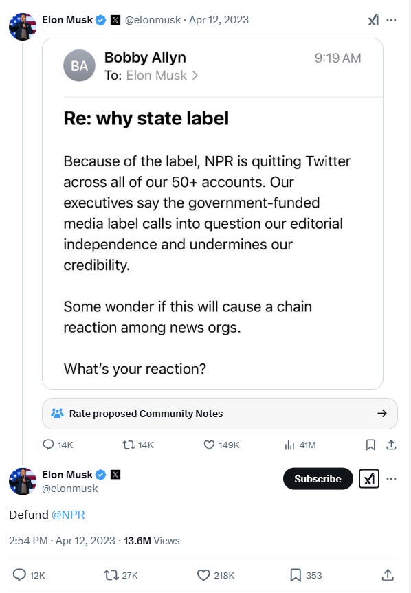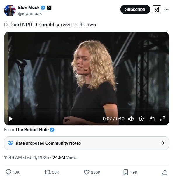 Musk reacted writing, “Defund NPR. It should survive on its own.”