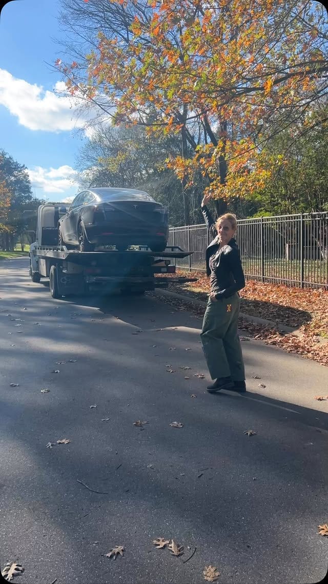 In a post to Instagram, Crow shared a video of herself waving goodbye to her Tesla as it was towed away on a flat bed truck.