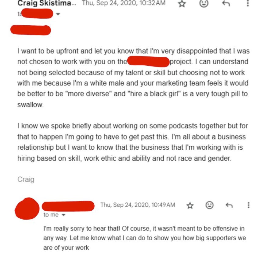 In the attached email exchange, Skistimas wrote, “I want to be upfront and let you know that I’m very disappointed that I was not chosen to work with you on the [redacted] project. I can understand not being selected because of my talent or skill but choosing not to work with me because I’m a white male and your marketing team feels it would be better to be ‘more diverse’ and ‘hire a black girl’ is a very tough pill to swallow.”