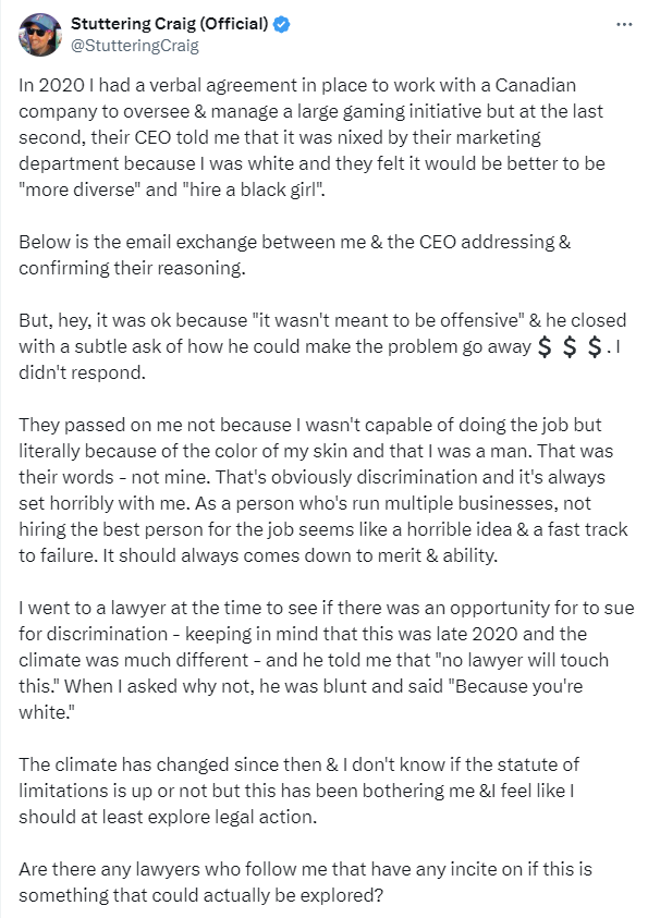 In a post to X, Skistimas wrote, “In 2020 I had a verbal agreement in place to work with a Canadian company to oversee & manage a large gaming initiative but at the last second, their CEO told me that it was nixed by their marketing department because I was white and they felt it would be better to be ‘more diverse’ and ‘hire a black girl’.”