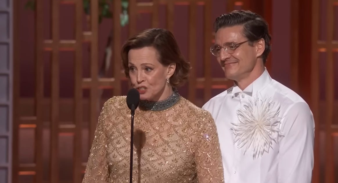 Weaver alongside Pedro Pascal, who both star in the film, appeared at the podium. Weaver said, “Sometimes even alien worlds that our characters live in.”