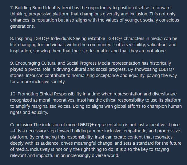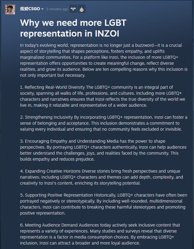 The user also stated, “The inclusion of more LGBTQ+ representation is not just a creative choice—it is a necessary step toward building a more inclusive, empathetic, and progressive platform. By embracing this responsibility, Inzoi can create content that resonates deeply with its audience, drives meaningful change, and sets a standard for the future of media. Inclusivity is not only the right thing to do; it is also the key to staying relevant and impactful in an increasingly diverse world.”