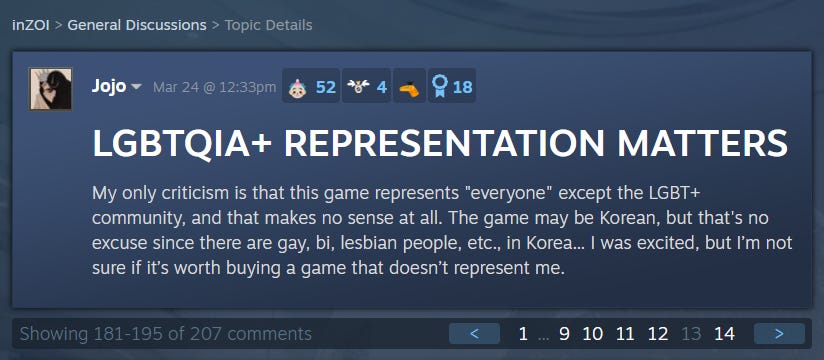 Another posted, “My only criticism is that this game represents ‘everyone’ except the LGBT+ community, and that makes no sense at all. The game may be Korean, but that's no excuse since there are gay, bi, lesbian people, etc., in Korea... I was excited, but I’m not sure if it’s worth buying a game that doesn’t represent me.”
