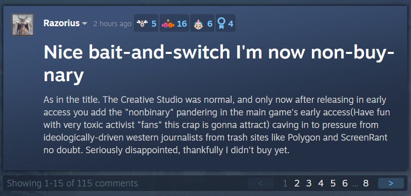 With the change there has also been pushback with one individual stating, “The Creative Studio was normal, and only now after releasing in early access you add the ‘nonbinary’ pandering in the main game's early access(Have fun with very toxic activist ‘fans’ this crap is gonna attract) caving in to pressure from ideologically-driven western journalists from trash sites like Polygon and ScreenRant no doubt. Seriously disappointed, thankfully I didn't buy yet.”