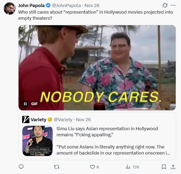 John Papola questioned, “Who still cares about ‘representation’ in Hollywood movies projected into empty theaters?”