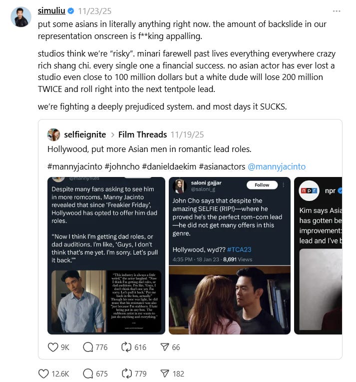 “studios think we’re ‘risky,’ he continued. “minari farewell past lives everything everywhere crazy rich shang chi. every single one a financial success. no asian actor has ever lost a studio even close to 100 million dollars but a white dude will lose 200 million TWICE and roll right into the next tentpole lead.”
