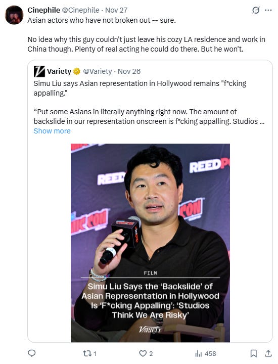“Asian actors who have not broken out -- sure. No idea why this guy couldn’t just leave his cozy LA residence and work in China though. Plenty of real acting he could do there. But he won’t,” wrote another.