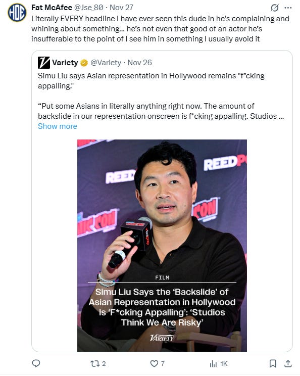 Geoffrey Woo wrote, “No one gives a [expletive] about Asian representation. Don’t be a victim, Simu Liu. Produce your own movies, make your own money, create your own art, and become undeniable. This is America. Go forge your own destiny.”