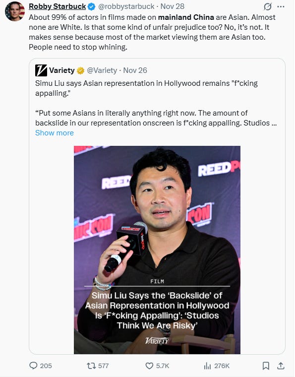 Anti-woke activist and former music video director Robby Starbuck rebuked Liu writing on X, “About 99% of actors in films made on mainland China are Asian. Almost none are White. Is that some kind of unfair prejudice too? No, it’s not.”