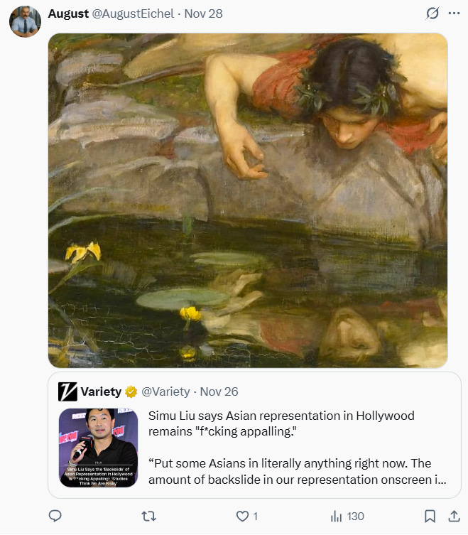 One person simply shared a painting of Narcissus pining away at his own reflection.
