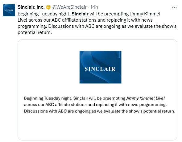 Sinclair announced that it will continue to preempt Jimmy Kimmel Live! after The Walt Disney Company announced it would return the program to air on September 23rd.