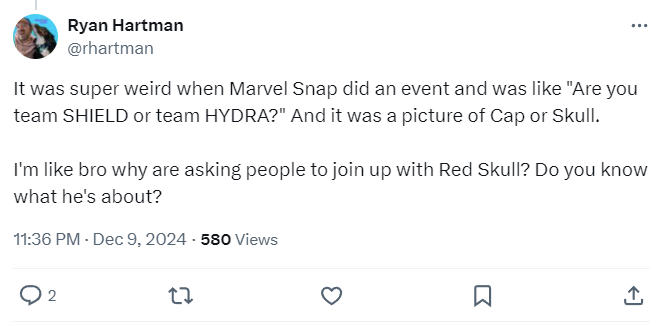 Another wrote, “It was super weird when Marvel Snap did an event and was like ‘Are you team SHIELD or team HYDRA?’ And it was a picture of Cap or Skull. I'm like bro why are asking people to join up with Red Skull? Do you know what he's about?”