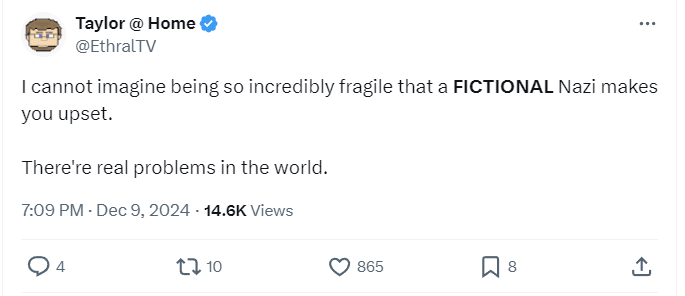 “I cannot imagine being so incredibly fragile that a FICTIONAL Nazi makes you upset. There're real problems in the world,” wrote another.