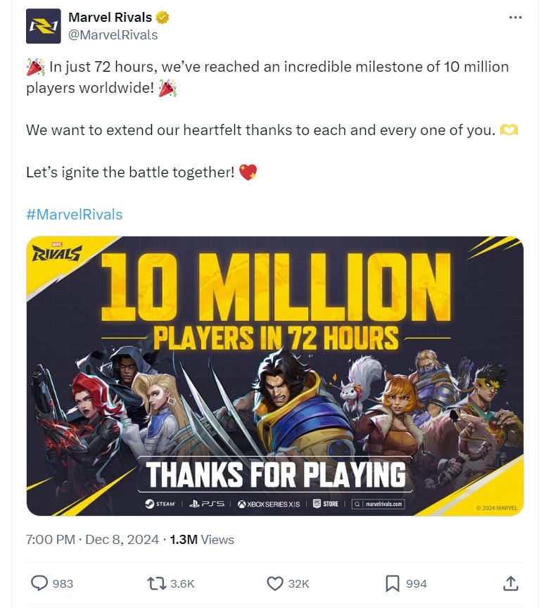 Marvel Rivals released on December 6th and the game quickly hit an all-time peak of 480,990 concurrent players. The game’s popularity has not trailed off as it hit a 24-hour peak of 460,883 concurrent players.