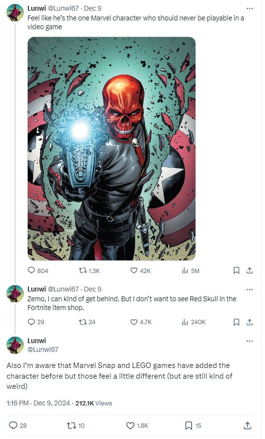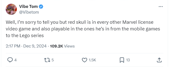 One wrote, “Well, I’m sorry to tell you but red skull is in every other Marvel license video game and also playable in the ones he’s in from the mobile games to the Lego series.”