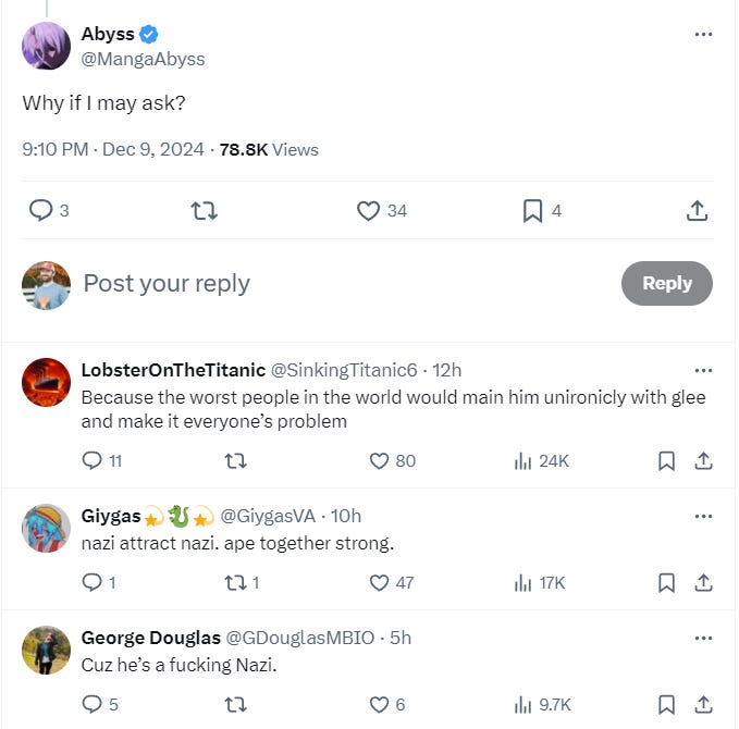 “Because the worst people in the world would main him unironicly with glee and make it everyone’s problem,” wrote one.