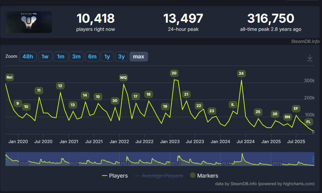 Destiny 2 hit a peak concurrent player count on Steam of 316,750 back in February 2023 when Lightfall released. The game would get close to that mark in June 2024 with the release of Season 24 Echoes. However, since then the concurrent player counts plummeted. The most recent 24-hour peak was only 13,497. In fact, SteamDB reports the average peak player count in the last 30 days is the lowers it has ever been at 13,443.
