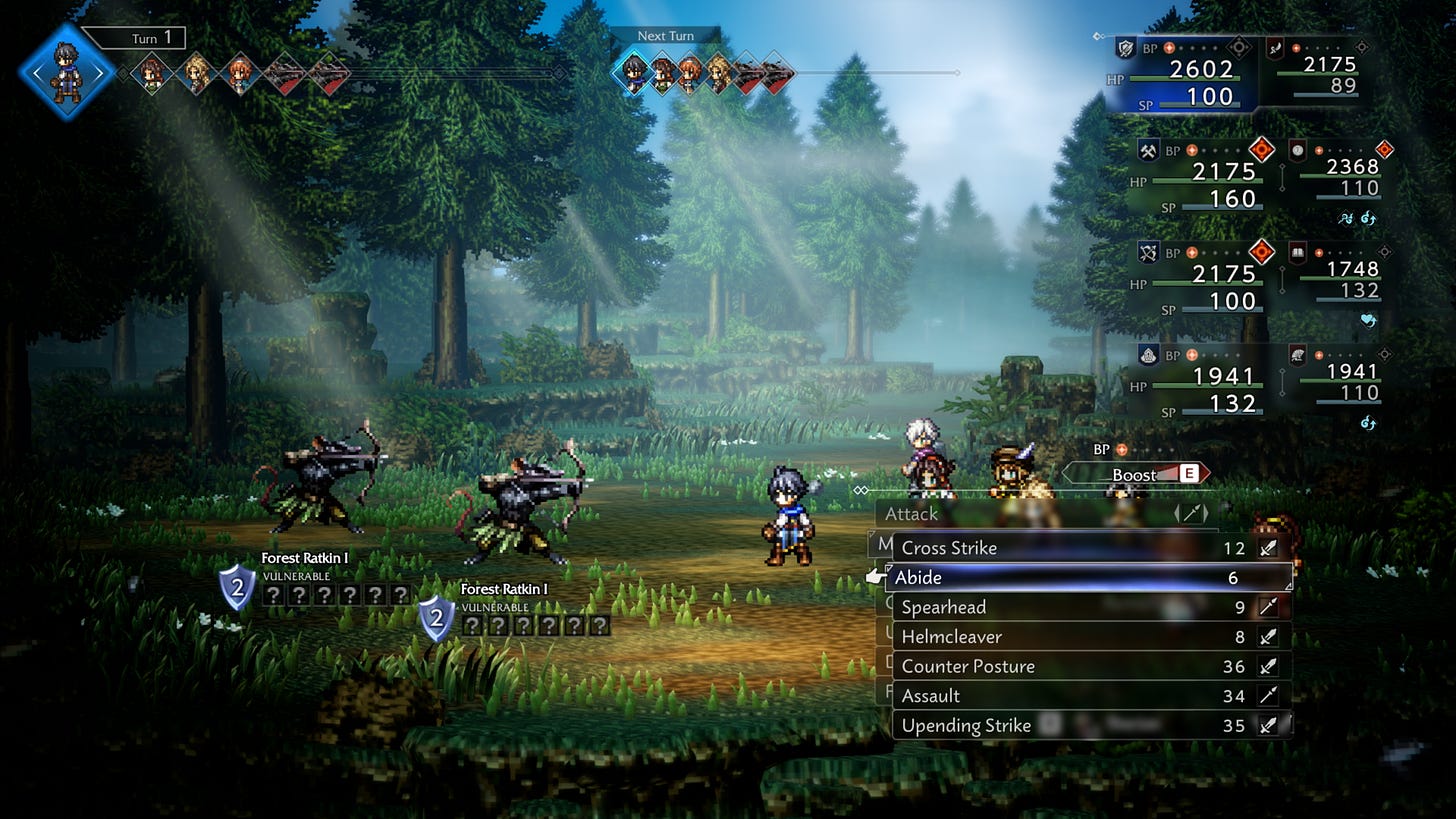 The series’ turn-based combat ‘Break and Boost’ battle system returns. Players must exploit enemies weaknesses to remove their shield points. Once these have been reduced to zero, foes are stunned and take increased damage.