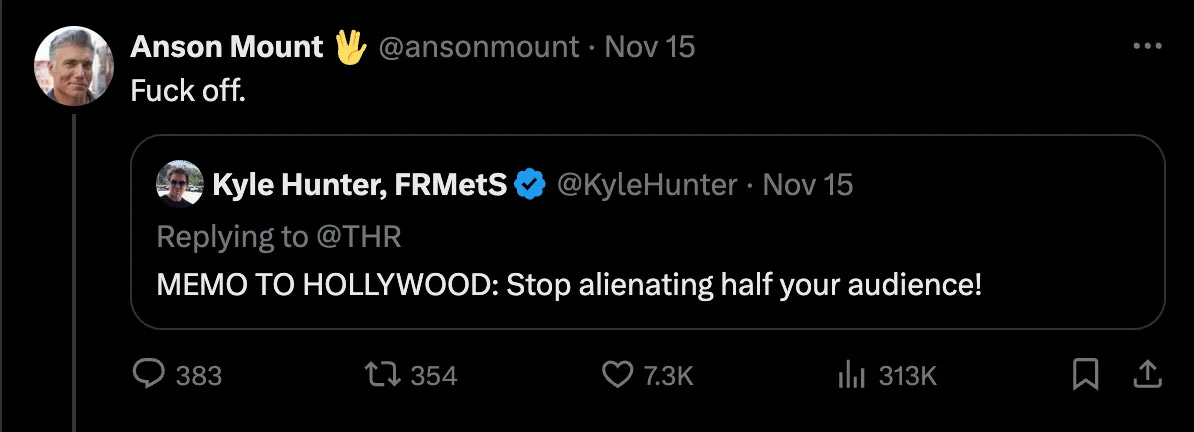 Kyle Hunter posted to X, “MEMO TO HOLLYWOOD: Stop alienating half your audience!”