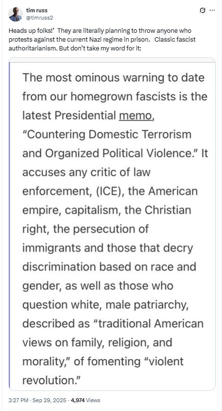 He then shared a screenshot from Chris Hedge’s article on CounterCurrents.org titled “Trump’s War on America.” The excerpt states, “The most ominous warning to date from our homegrown fascists is the latest Presidential memo, ‘Countering Domestic Terrorism and Organized Political Violence.’ It accuses any critic of law enforcement, (ICE), the American empire, capitalism, the Christian right, the persecution of immigrants and those that decry discrimination based on race and gender, as well as those who question white, male patriarchy, described as ‘traditional American views on family, religion, and morality,’ of fomenting ‘violent revolution.’”
