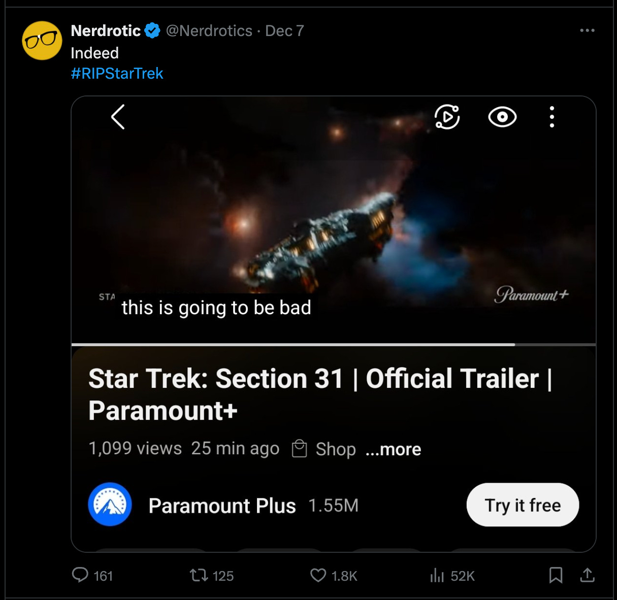 Pop culture expert Nerdrotic also mocked the “This is going to be bad” tagline with a post on X highlighting the trailer’s mistake. He posted, “Indeed #RIPStarTrek” along with a screen capture of the trailer with subtitles.