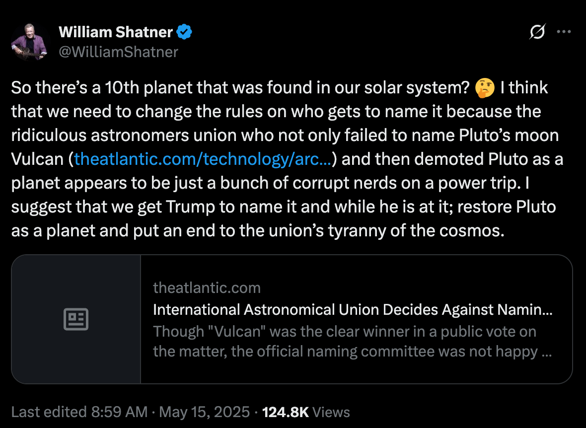 With this, he linked to an article about the International Astronomical Union voting against naming Pluto ‘Vulcan’ which came from 2013, something apparently Shatner bookmarked or remembered.