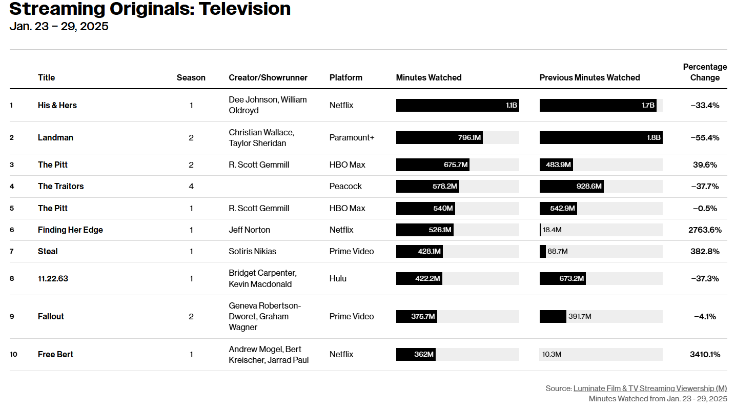 Luminate’s most recent data is for the week of January 23-29, which would include data for the show’s third episode that dropped on the 22nd and initial numbers for the fourth episode, which arrived on the 29th. The show is nowhere to be found.