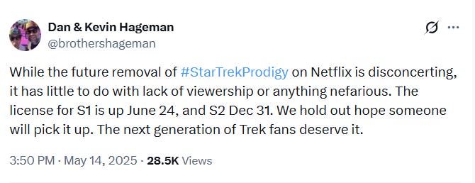 Star Trek: Prodigy was originally produced and distributed by Paramount on Paramount+. However, the company scrapped the show following its first season in 2023. Netflix struck a deal with Paramount to exclusively stream the first season as well as the unaired second season. However, it was announced in May that the series would not be renewed for a third season and that the licensing deal expired at the end of the year.