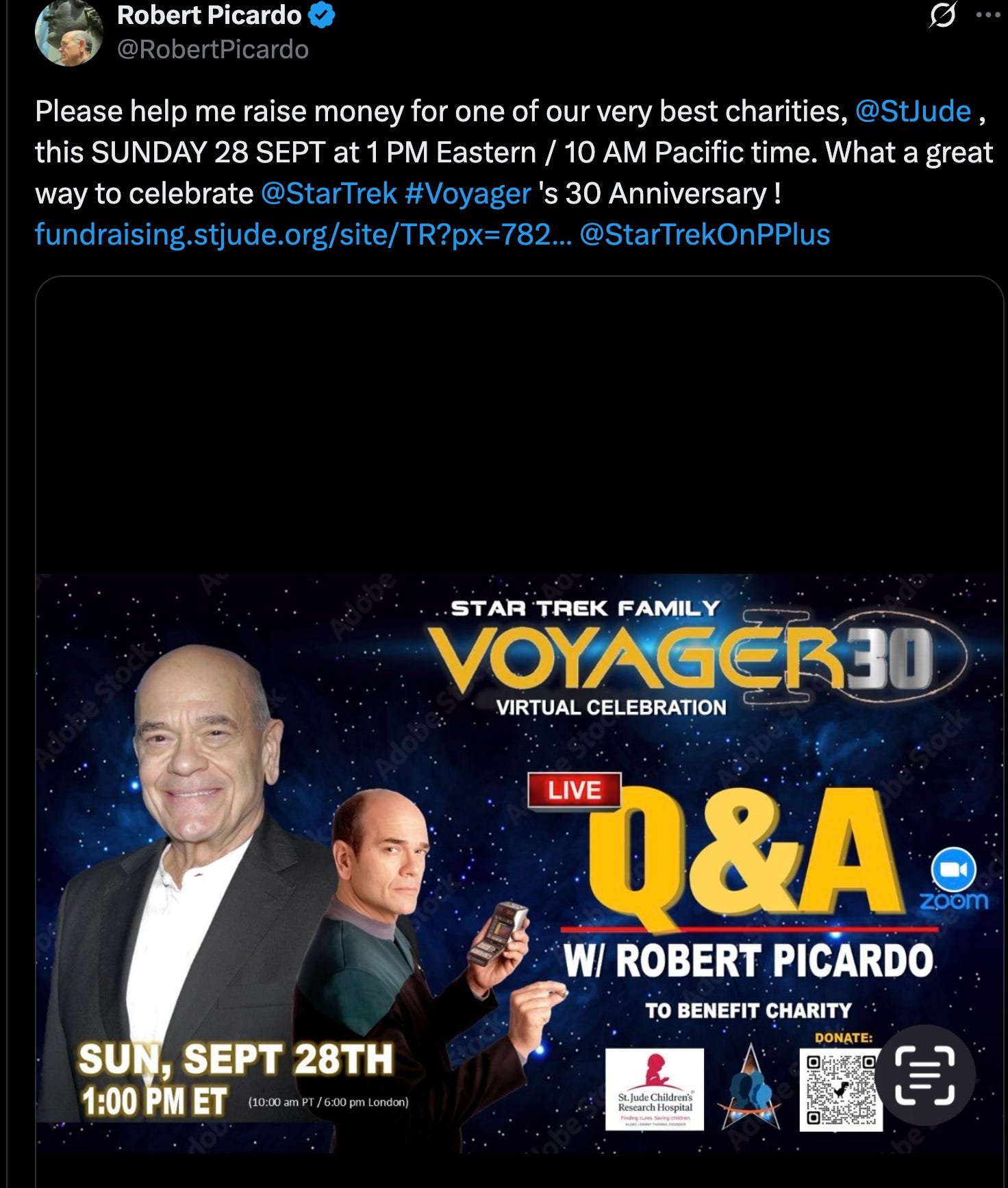 Picardo posted to X: “Please help me raise money for one of our very best charities, @StJude, this SUNDAY 28 SEPT at 1 PM Eastern / 10 AM Pacific time. What a great way to celebrate @StarTrek #Voyager ‘s 30 Anniversary ! https://fundraising.stjude.org/site/TR?px=7822926&fr_id=133399&pg=personal @StarTrekOnPPlus”