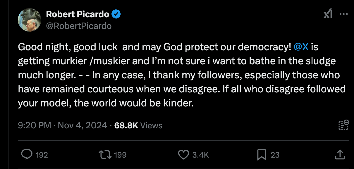 Picardo made it clear he didn’t like X because he received pushback there, unlike other social media echo chambers. He said, “Good night, good luck and may God protect our democracy! @X is getting murkier /muskier and I’m not sure i want to bathe in the sludge much longer. - - In any case, I thank my followers, especially those who have remained courteous when we disagree. If all who disagree followed your model, the world would be kinder.”