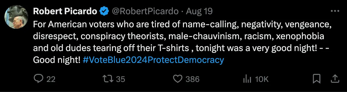 He made a post on this, saying, “For American voters who are tired of name-calling, negativity, vengeance, disrespect, conspiracy theorists, male-chauvinism, racism, xenophobia and old dudes tearing off their T-shirts , tonight was a very good night! - - Good night! #VoteBlue2024ProtectDemocracy” reads one of his many tiresome political posts.