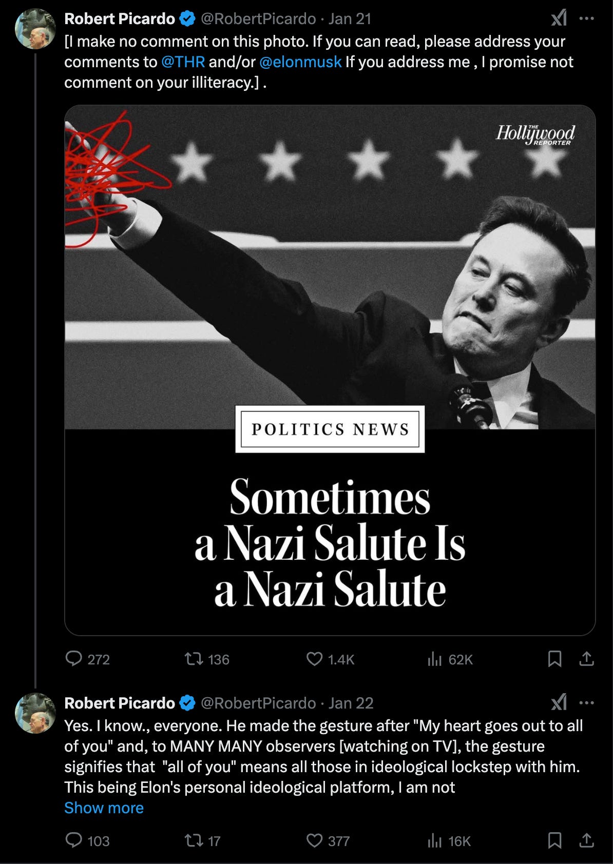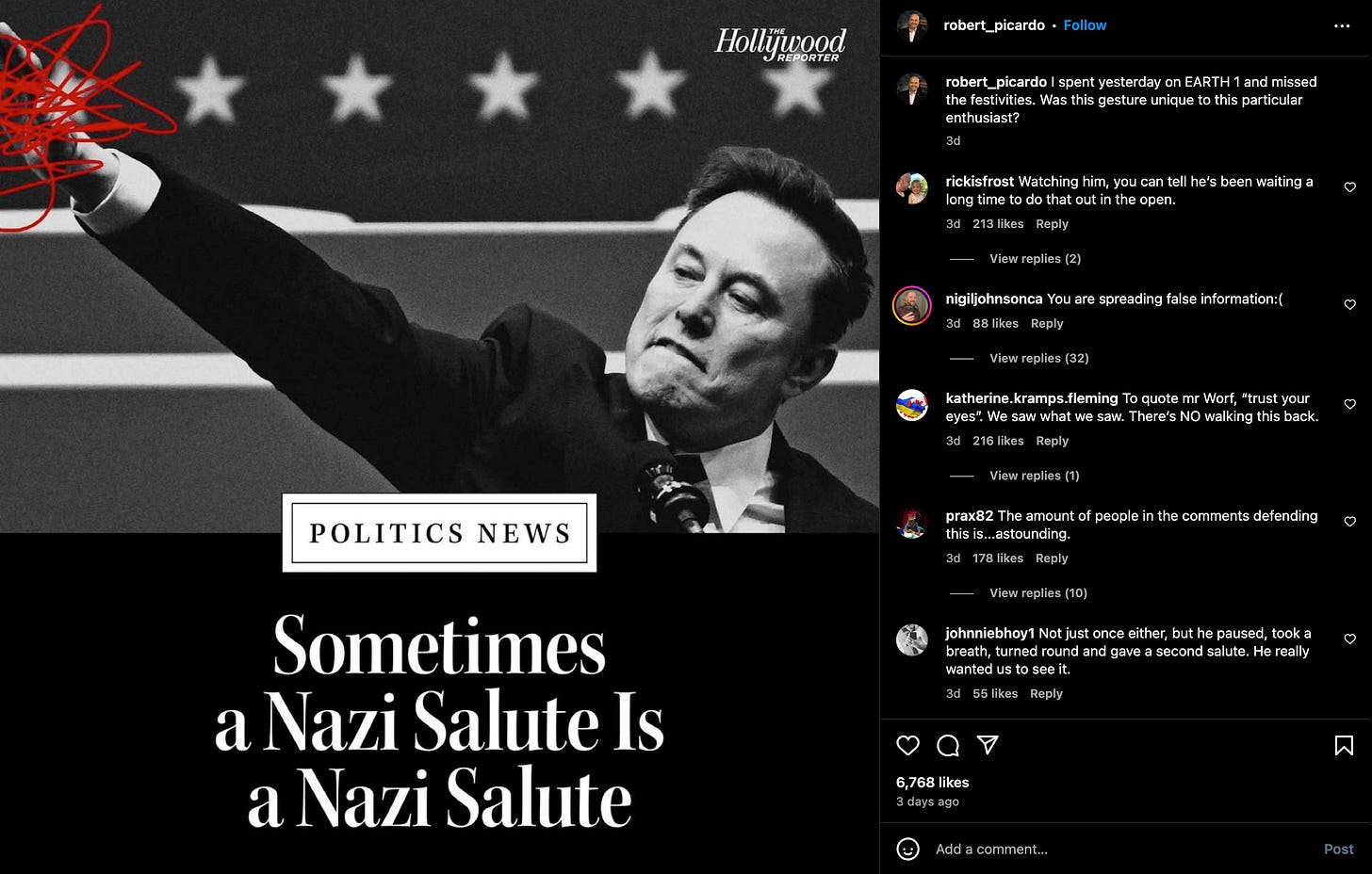 Picardo posted an edited image of this to multiple platforms, beginning with Instagram, where Elon Musk is shown in black and white and with the text, “Sometimes a Nazi salute is a Nazi salute.”