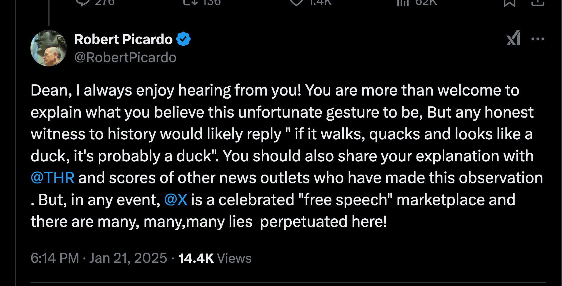 As much as he promised not to comment. He lft one immediately on his own post, “Dean, I always enjoy hearing from you! You are more than welcome to explain what you believe this unfortunate gesture to be, But any honest witness to history would likely reply " if it walks, quacks and looks like a duck, it's probably a duck". You should also share your explanation with @THRand scores of other news outlets who have made this observation . But, in any event, @X is a celebrated "free speech" marketplace and there are many, many,many lies perpetuated here!”