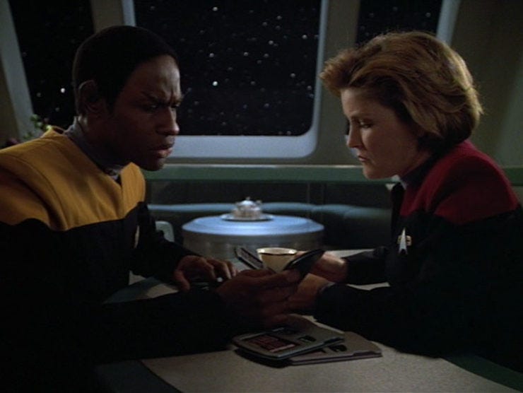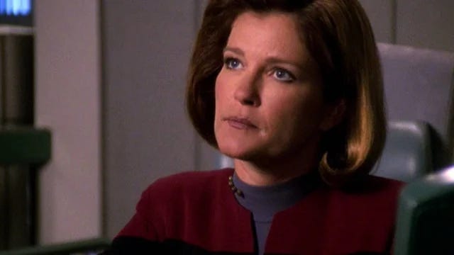 For those who don’t know, Kate Mulgrew played Captain Janeway in the 1990s installment of Star Trek: Voyager. The show lasted seven years, and while it still felt like Star Trek, fans didn’t relate to it as much as The Original Series, The Next Generation, or Deep Space 9, often citing the bland character work as a reason. Janeway, in particular, was written very inconsistently, and there were often jokes at the time that her commanding style in the episode would depend on whatever changing hairstyle the makeup department put her in that week.