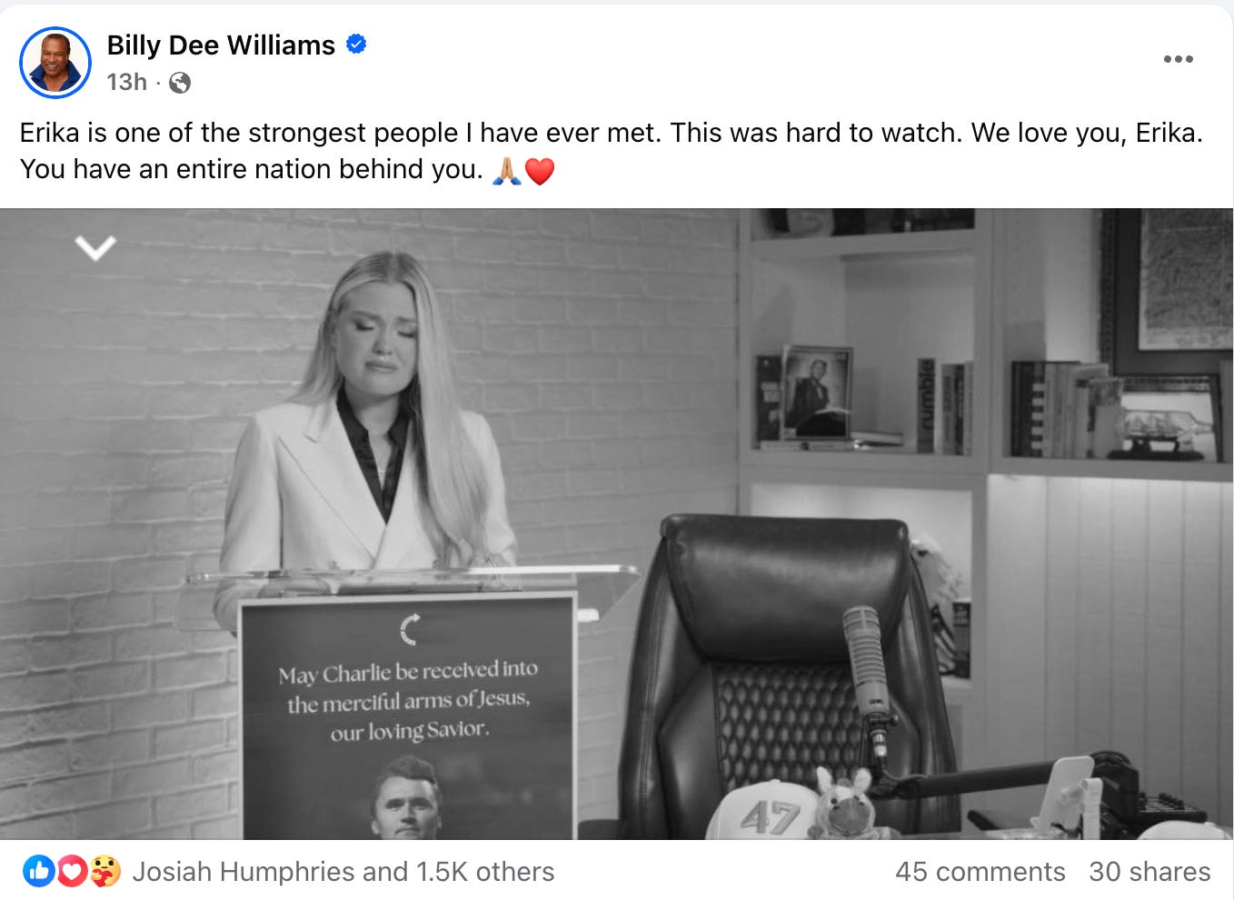 But a quick look on his feed, he goes much further, actually in support of Charlie’s wife Erika and his children, commenting on her address to the nation last evening, “Erika is one of the strongest people I have ever met. This was hard to watch. We love you, Erika. You have an entire nation behind you.”