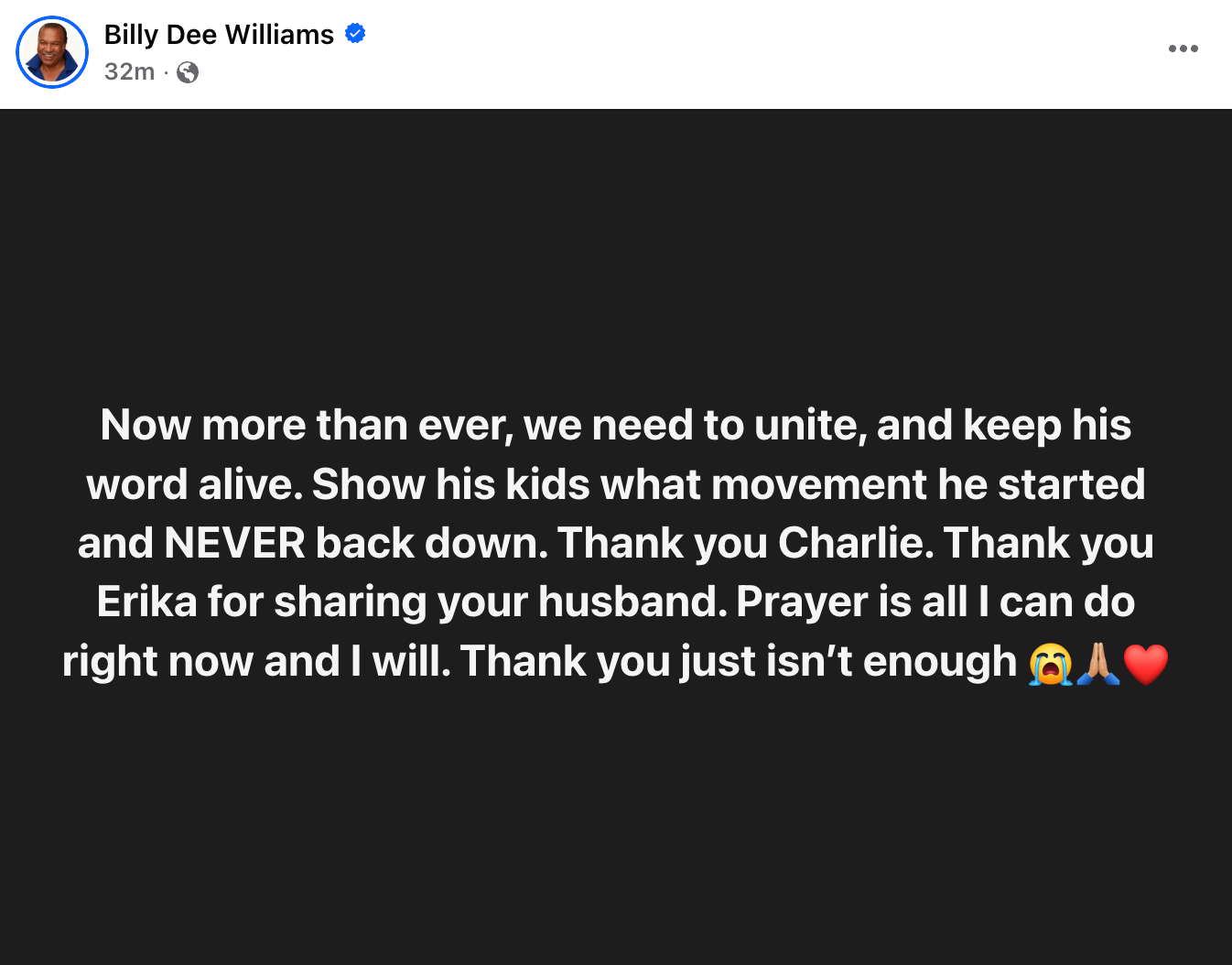 His most recent message amplifies the power of prayer, “Now more than ever, we need to unite, and keep his word alive. Show his kids what movement he started and NEVER back down. Thank you Charlie. Thank you Erika for sharing your husband. Prayer is all I can do right now and I will. Thank you just isn’t enough .”