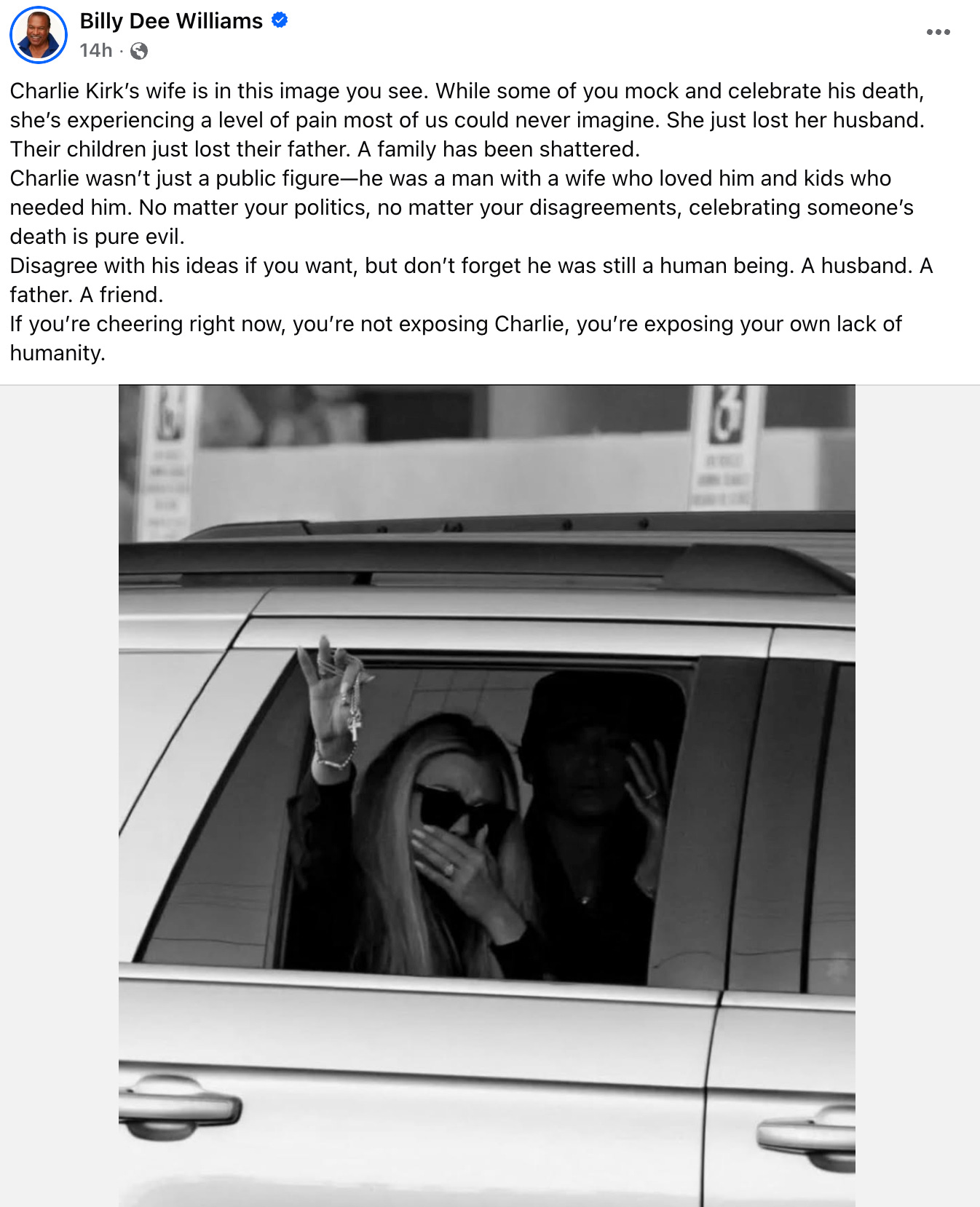 He has a message for those who are cheering on the situation as well, being a voice of sanity in Hollywood that few are brave enough to be, “Charlie Kirk’s wife is in this image you see. While some of you mock and celebrate his death, she’s experiencing a level of pain most of us could never imagine. She just lost her husband. Their children just lost their father. A family has been shattered. Charlie wasn’t just a public figure—he was a man with a wife who loved him and kids who needed him. No matter your politics, no matter your disagreements, celebrating someone’s death is pure evil. Disagree with his ideas if you want, but don’t forget he was still a human being. A husband. A father. A friend. If you’re cheering right now, you’re not exposing Charlie, you’re exposing your own lack of humanity.”